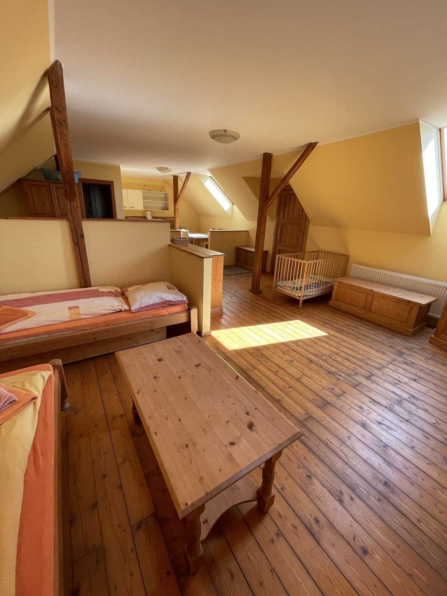 Oranžový apartmán má vlastní vchod po venkovním točitém schodišti. Každý apartmán má vlastní koupelnu se sprchovým koutem a WC, kuchyňský kout, ložní prádlo, ručníky, Wi-Fi a televizi. V apartmánu najdete také kompletní vybavení pro děti včetně postýlky, přebalovacího pultu, vaničky, židličky a nočníku.